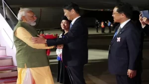 जापान की अपनी यात्रा समाप्त करने के बाद चीन रवाना होते समय प्रधानमंत्री नरेंद्र मोदी का अधिकारियों द्वारा स्वागत किया गया।