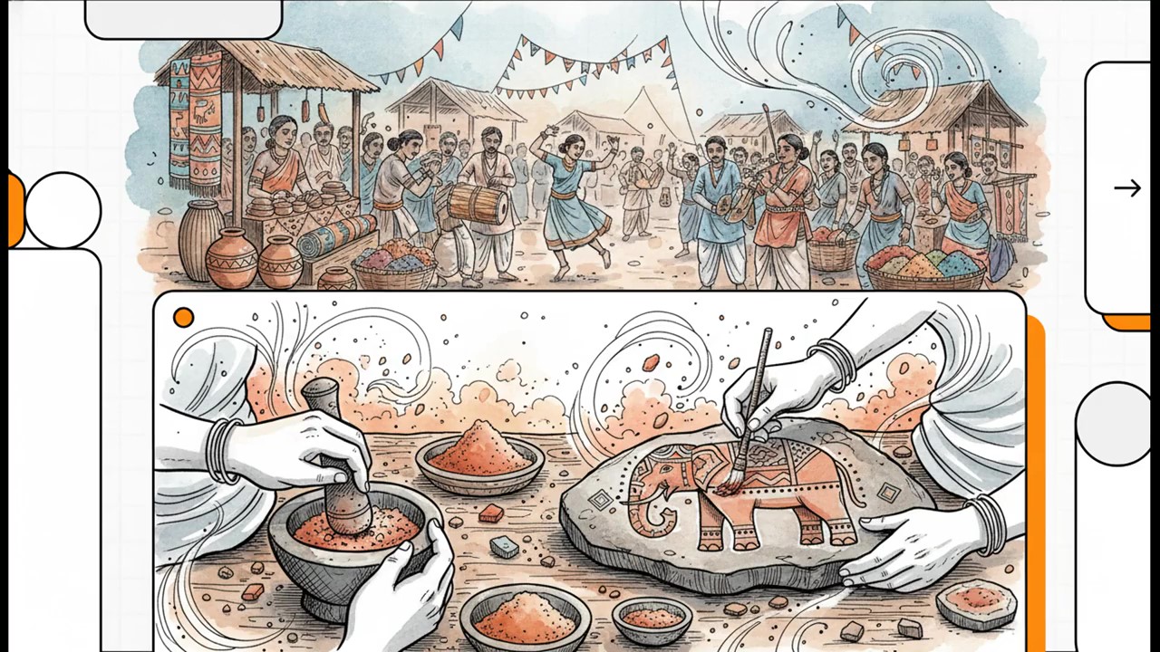 - आज हम Indore के Tribal Hat Bazaar के एक खास स्टॉल पर हैं, जहाँ Stone Dust Painting की कला अपने रंग-रूप में जीवंत हो उठी है. हमारा खास संवाद है पत्थर की धूल चित्रकारी के कलाकार ज्योति उमरे से