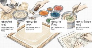 - Jyoti बताती है कि Stone Dust Painting कैसे पत्थर की महीन धूल को गोंद और रंगों से जोड़कर सतह पर टिकाती है, और कैसे यह तकनीक एक tactile, 3D-सी महसूस बनाती है।