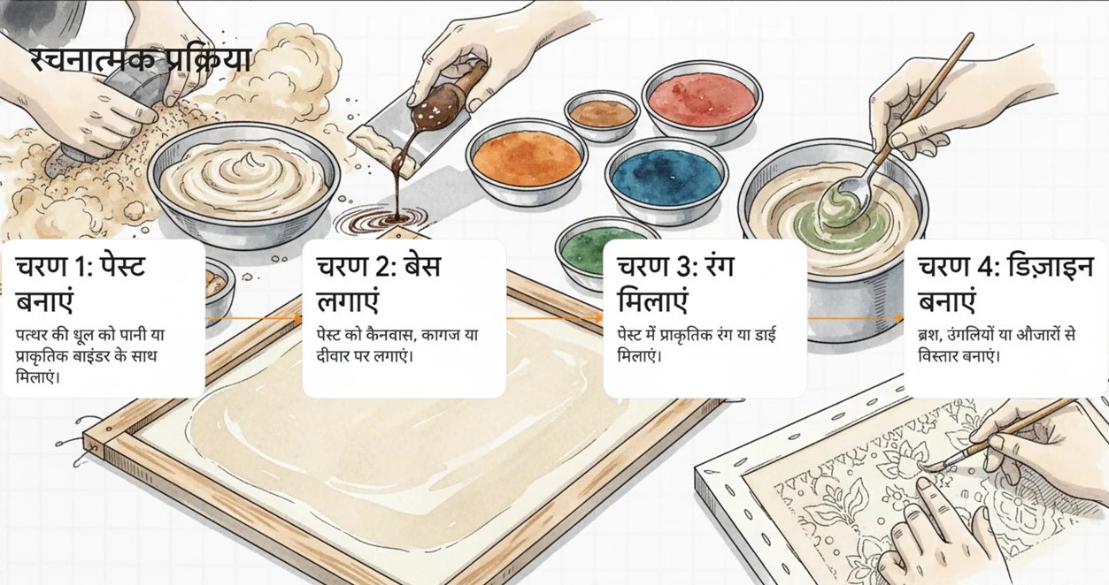 - पत्थर की धूल को पानी या प्राकृतिक बाइंडर के साथ मिलाकर पेस्ट बनाया जाता है।